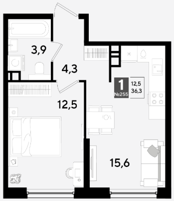 | 1 | 36.3 / 12.5 м² | от 7 014 230 руб. (193 229 руб./м²) | Планировка | |
