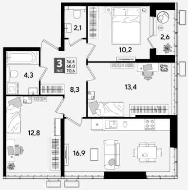 | 3 | 70.6 / 36.4 м² | от 10 095 800 руб. (143 000 руб./м²) | Планировка |