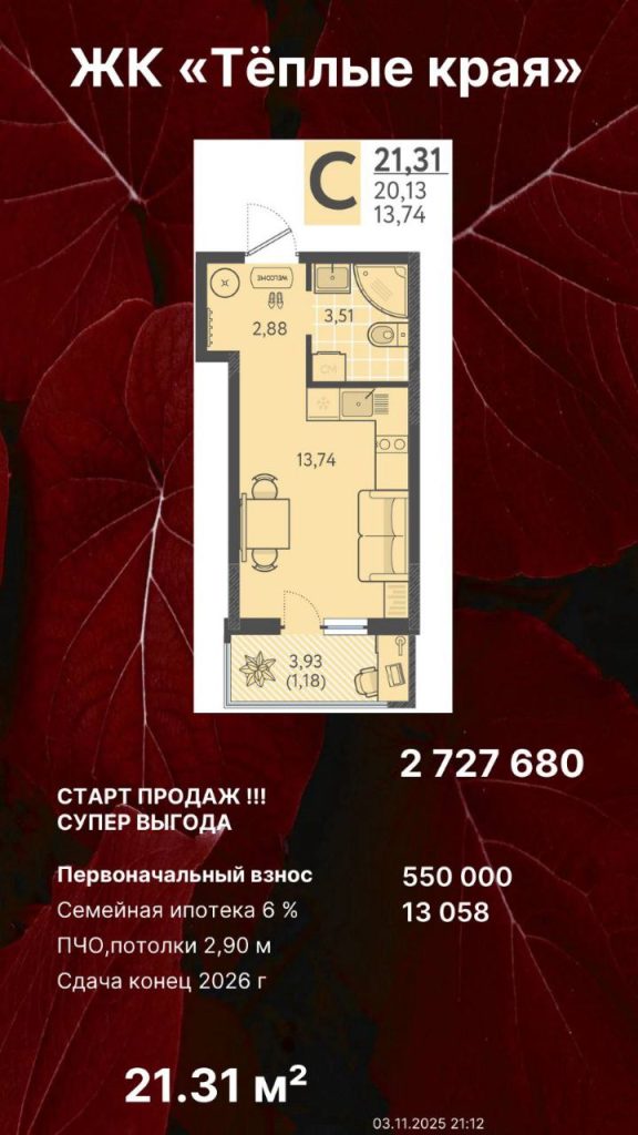 Студия — 21,31 м², стоимость от 2 727 000 ₽;