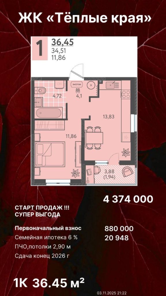 1-комнатная квартира — 36,45 м², стоимость от 4 374 000 ₽;