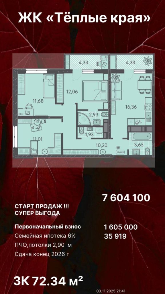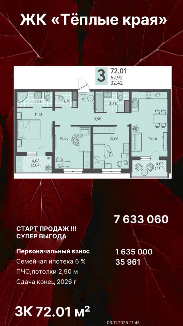 3-комнатная квартира — 72,34 м², стоимость от 7 604 000 ₽.