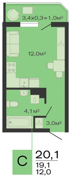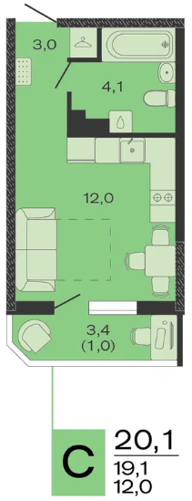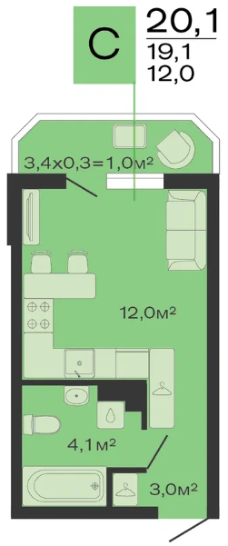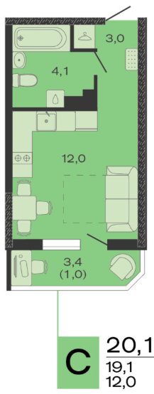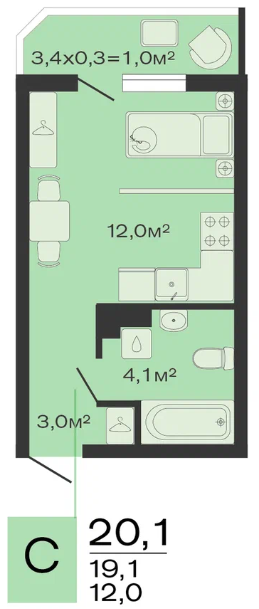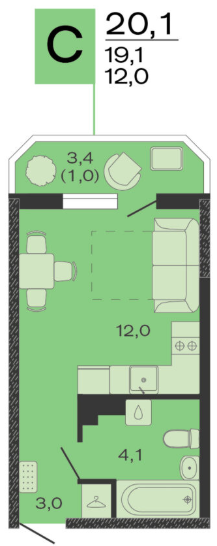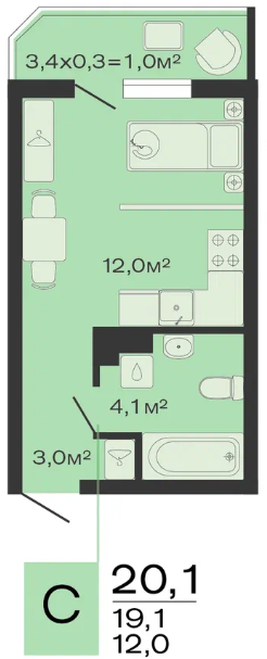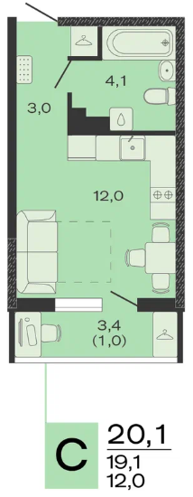 | студия | 20.1 / 12.0 м² | от 2 412 000 руб. (120 000 руб./м²) | Планировка | |