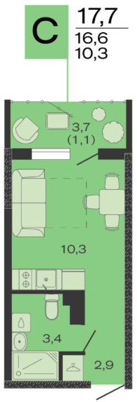 | студия | 18.5 / 10.3 м² | от 2 220 000 руб. (120 000 руб./м²) | Планировка | |