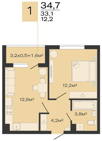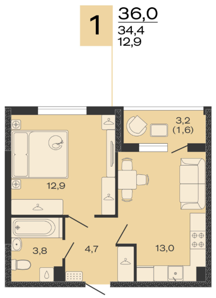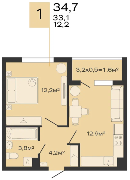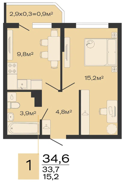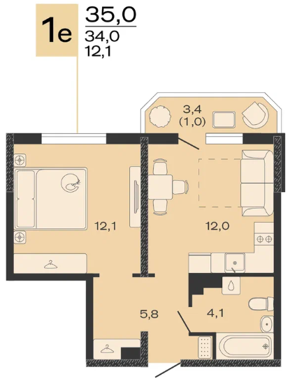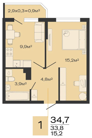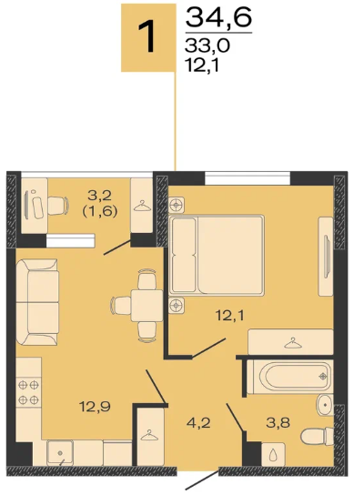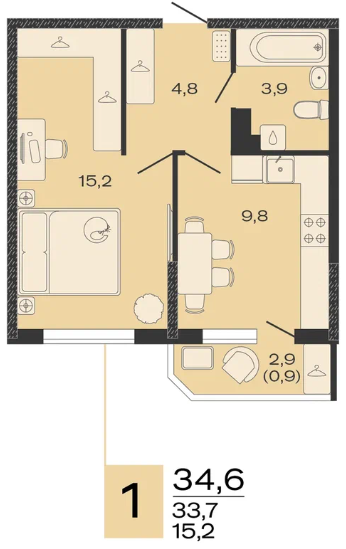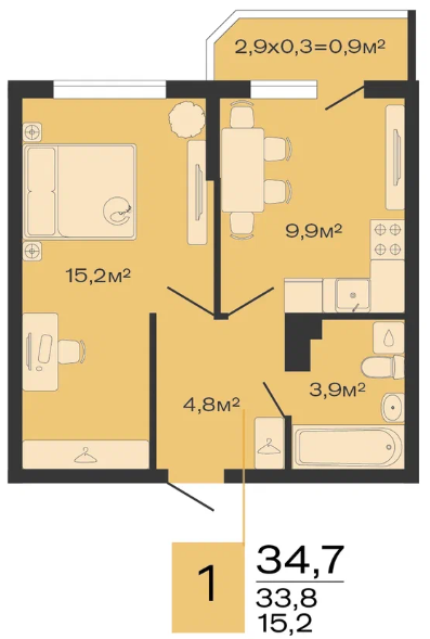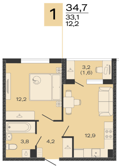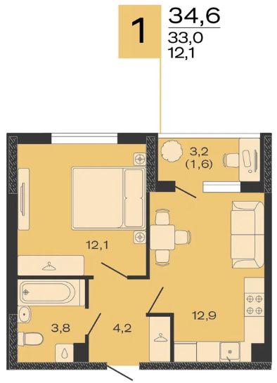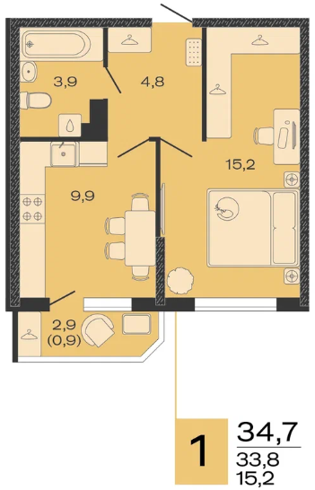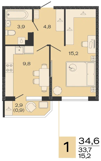 | 1 | 34.6 / 15.2 м² | от 3 806 000 руб. (110 000 руб./м²) | Планировка | |
