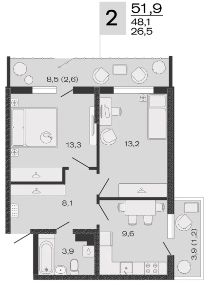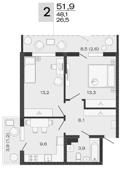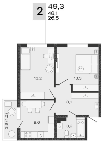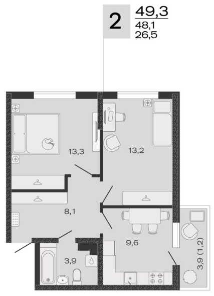 | 2 | 49.3 / 26.5 м² | от 5 423 000 руб. (110 000 руб./м²) | Планировка |