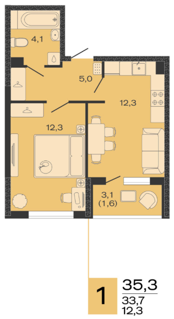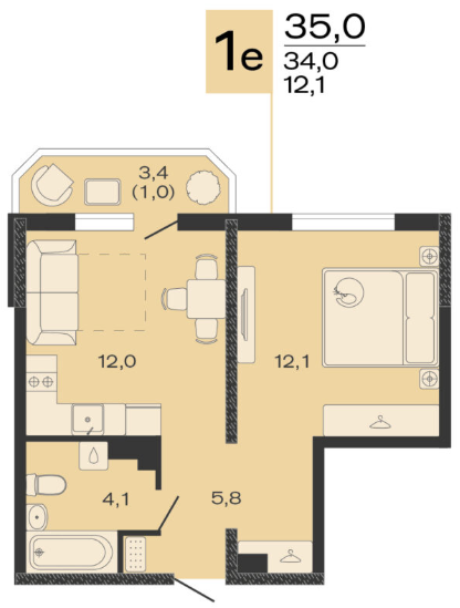 | 1 | 35.0 / 12.1 м² | от 3 850 000 руб. (110 000 руб./м²) | Планировка | |
