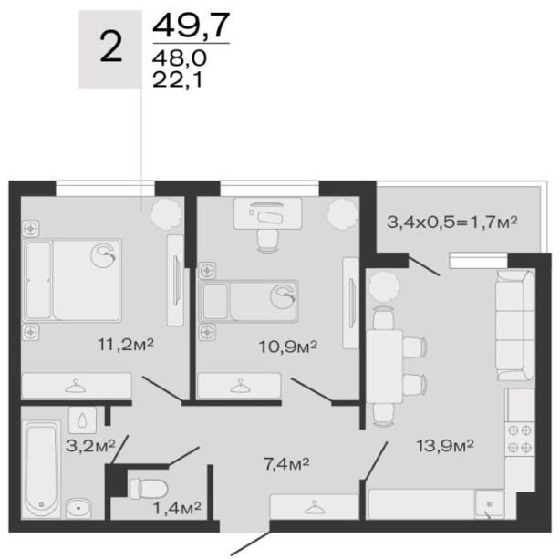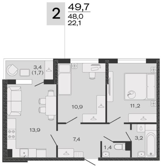 | 2 | 49.7 / 22.1 м² | от 5 467 000 руб. (110 000 руб./м²) | Планировка |