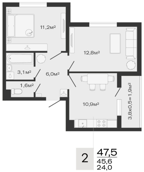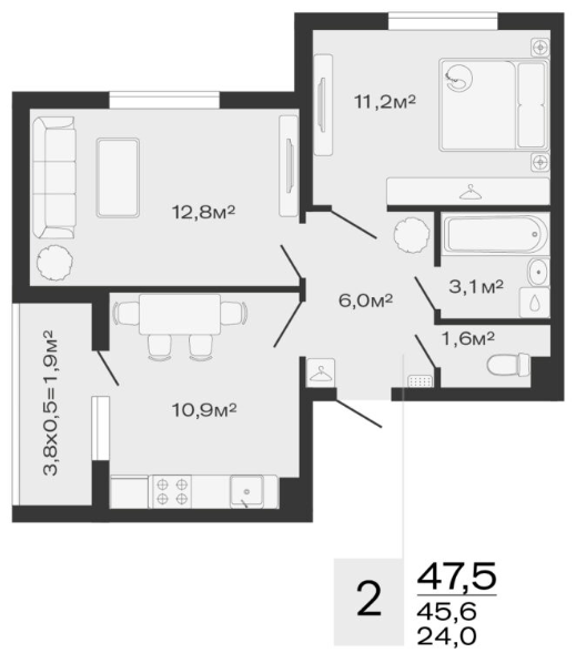 | 2 | 47.5 / 24.0 м² | от 5 225 000 руб. (110 000 руб./м²) | Планировка | |