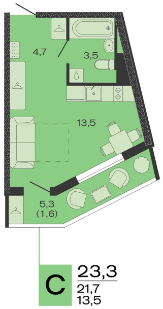 | студия | 23.3 / 13.5 м² | от 2 796 000 руб. (120 000 руб./м²) | Планировка | |