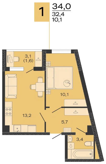 | 1 | 34.0 / 10.1 м² | от 3 740 000 руб. (110 000 руб./м²) | Планировка |