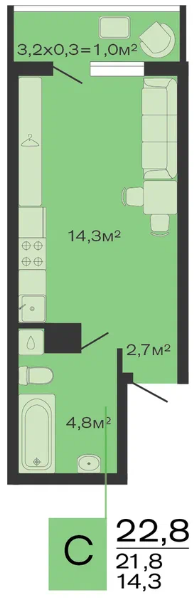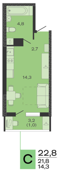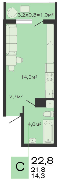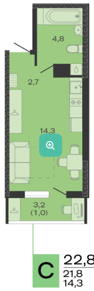 | студия | 22.8 / 14.3 м² | от 2 736 000 руб. (120 000 руб./м²) | Планировка | |