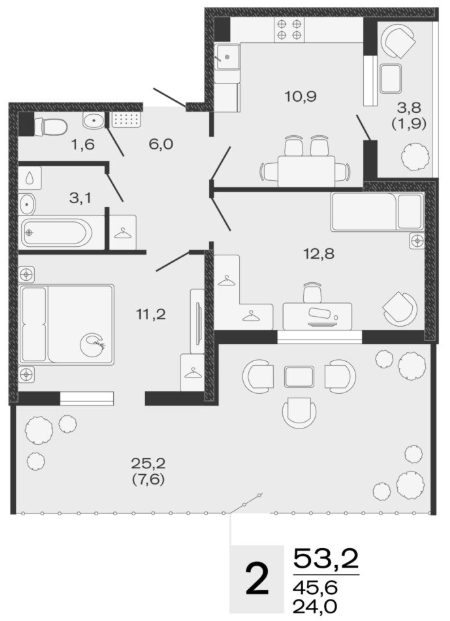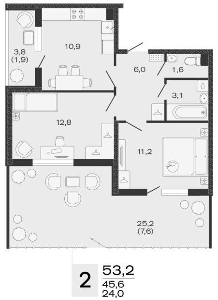 | 2 | 53.2 / 24.0 м² | от 5 852 000 руб. (110 000 руб./м²) | Планировка |