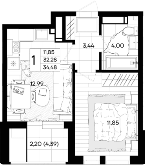 1 | 34.46 / 11.82 м² | от 4 755 480 руб. (138 000 руб./м²) | Планировка | |