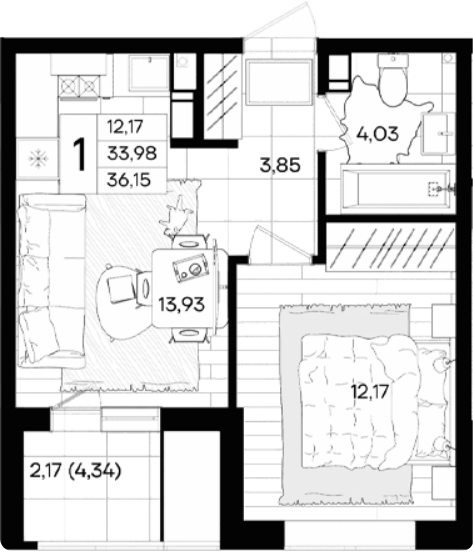 1 | 36.08 / 12.21 м² | от 4 979 040 руб. (138 000 руб./м²) | Планировка | |
