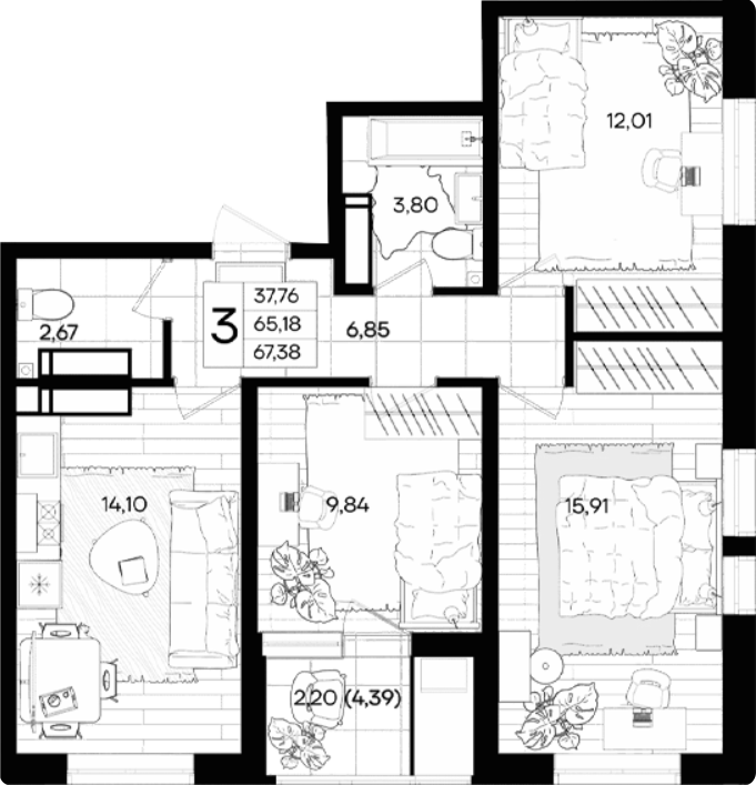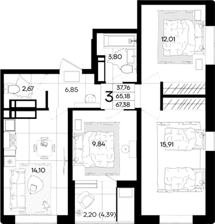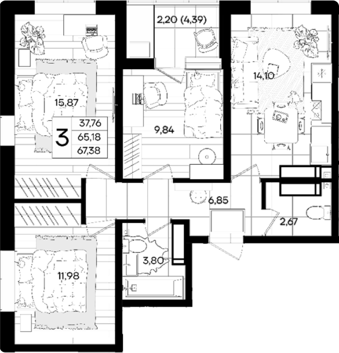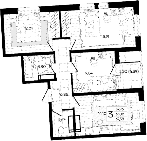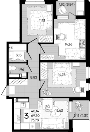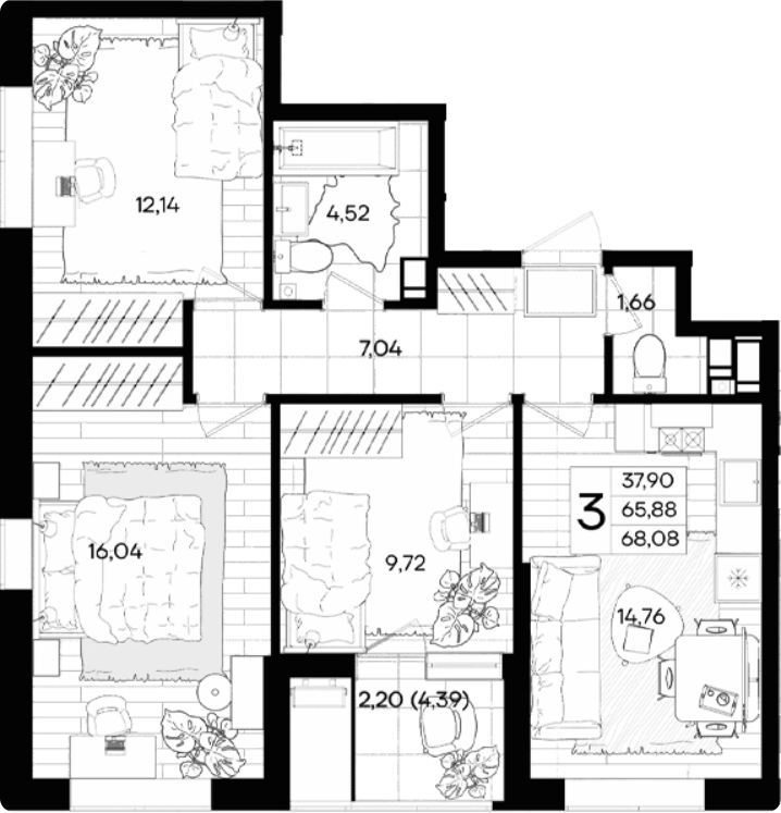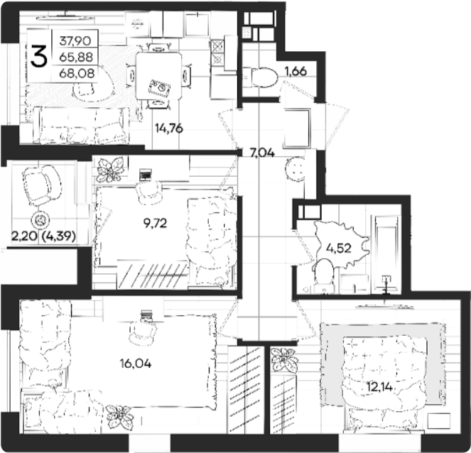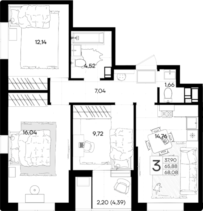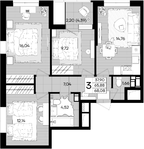 3 | 68.8 / 37.9 м² | от 7 430 400 руб. (108 000 руб./м²) | Планировка |