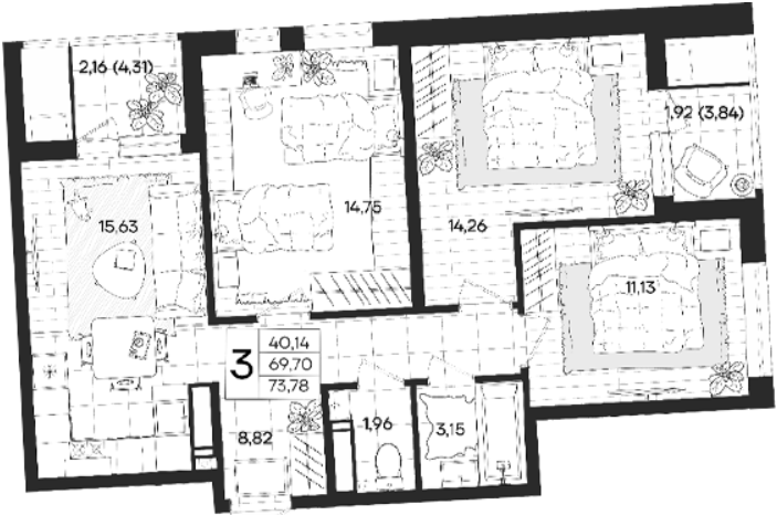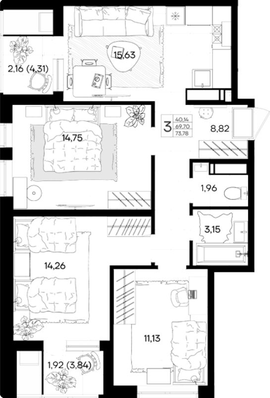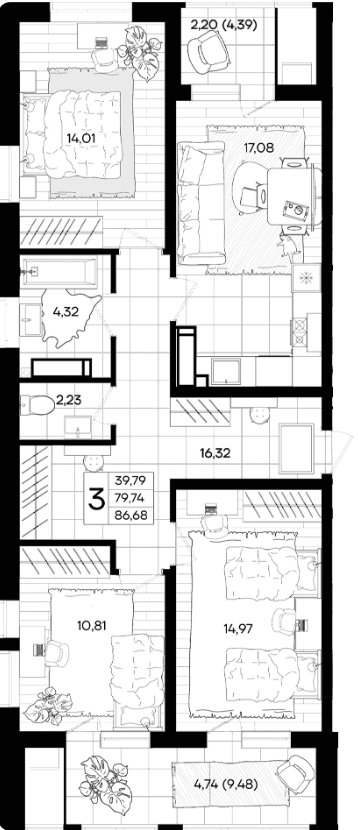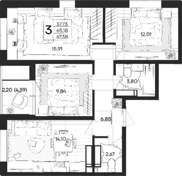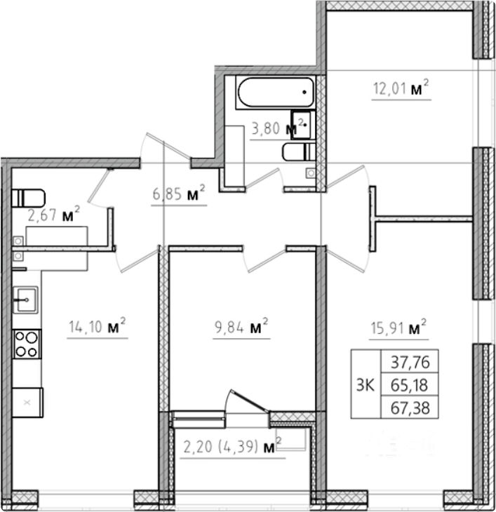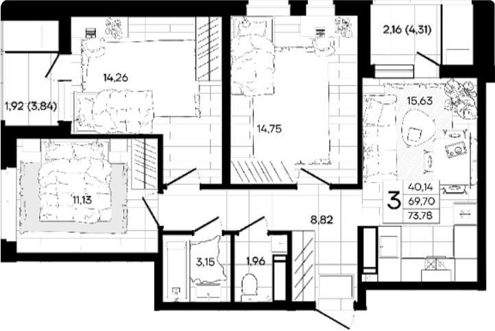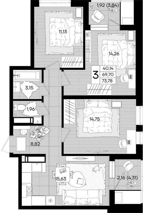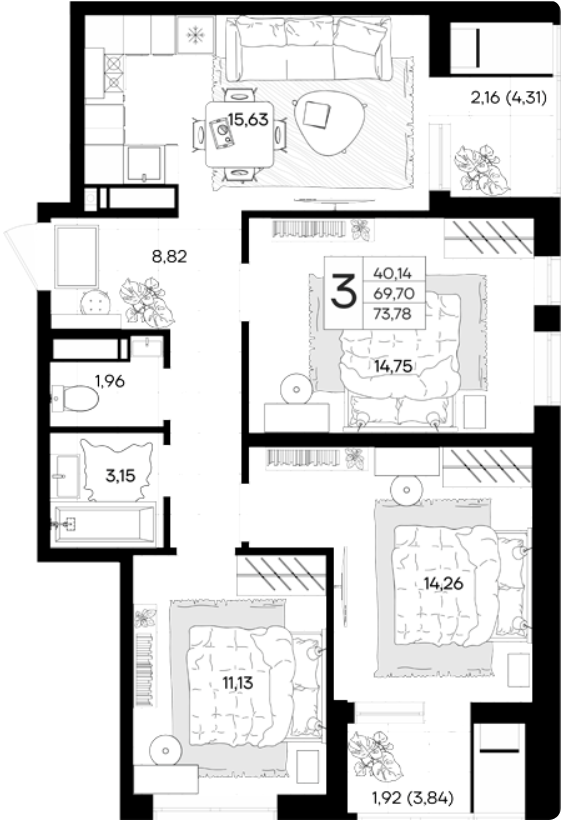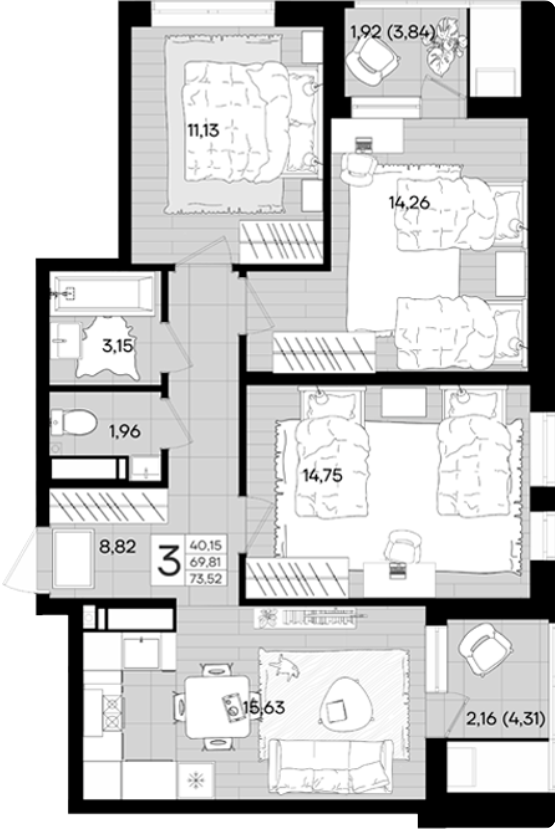 3 | 68.8 / 37.9 м² | от 7 430 400 руб. (108 000 руб./м²) | Планировка |