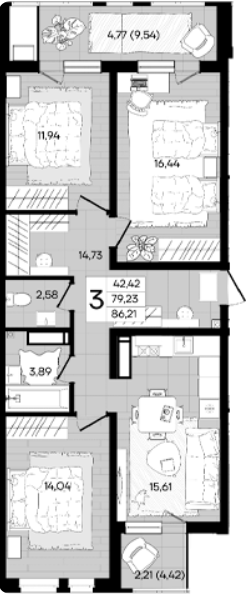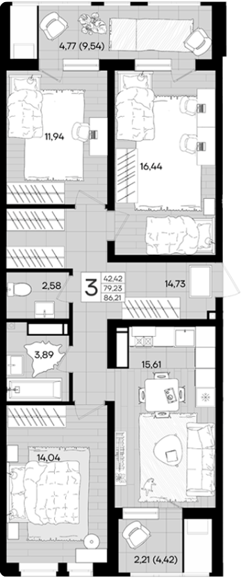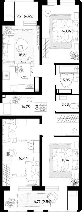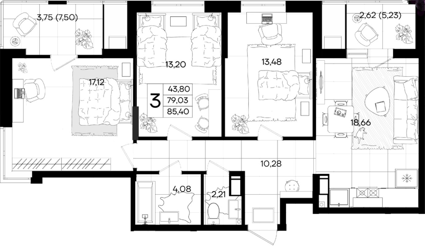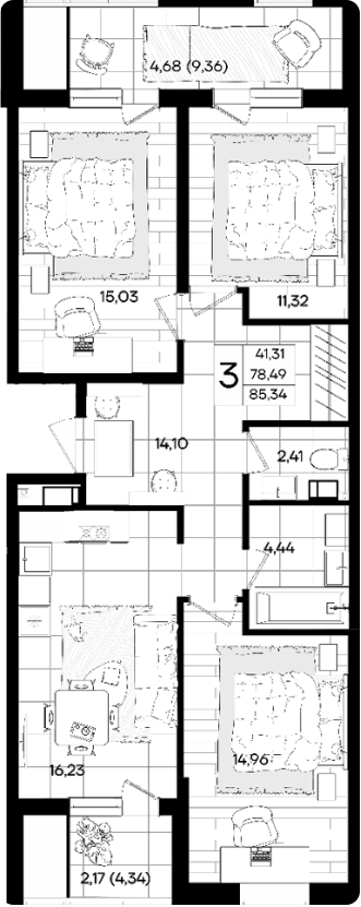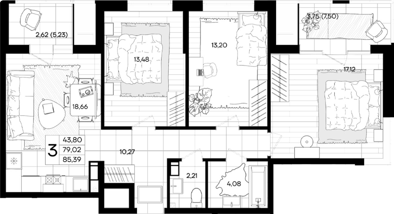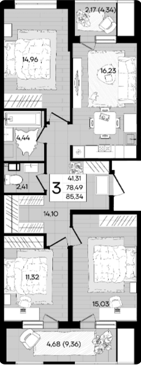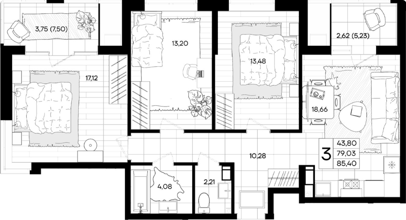 3 | 85.39 / 43.80 м² | от 9 222 120 руб. (108 000 руб./м²) | Планировка |