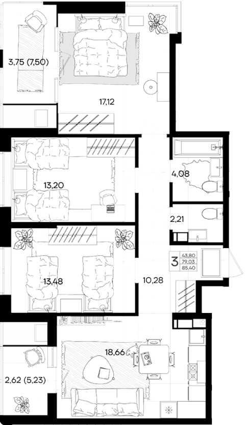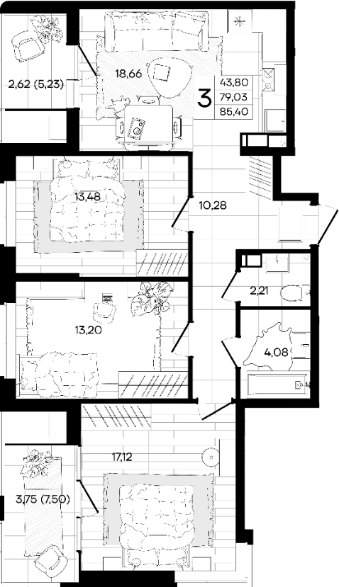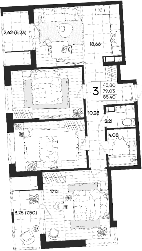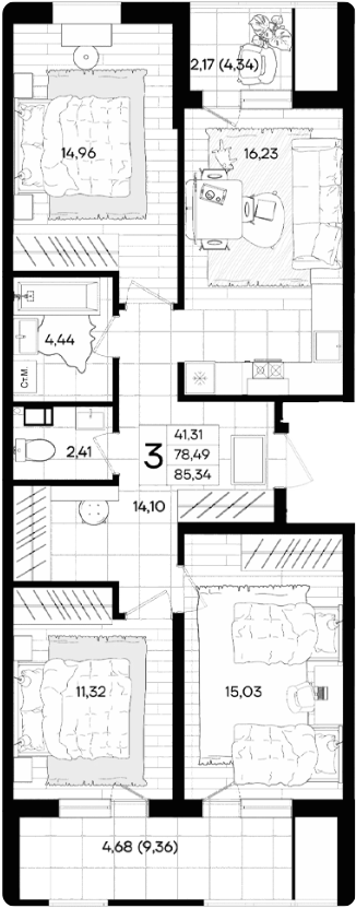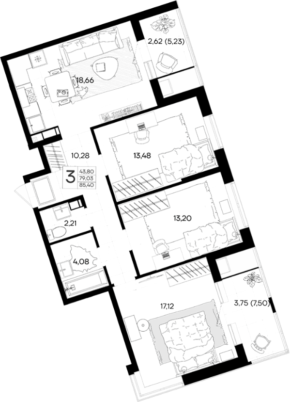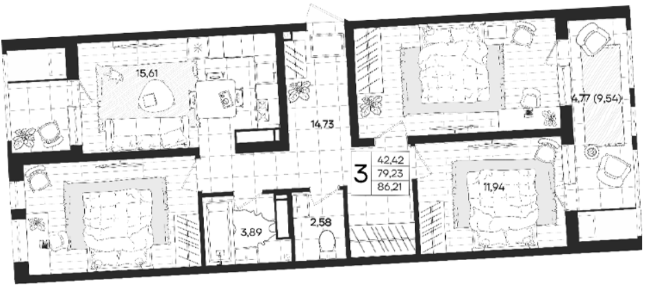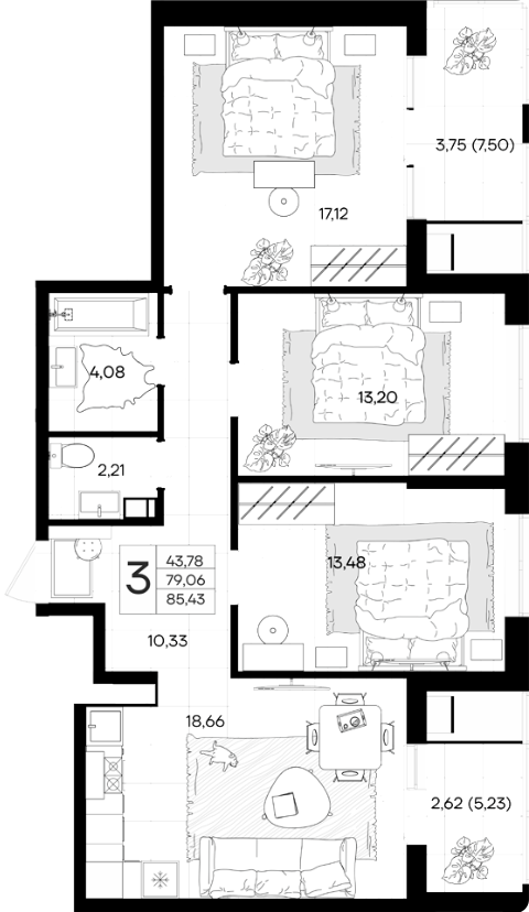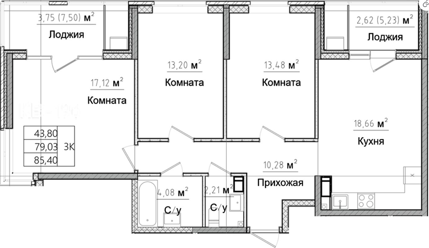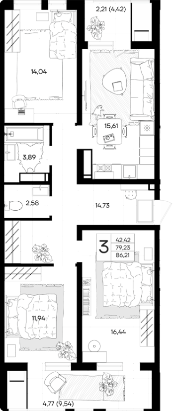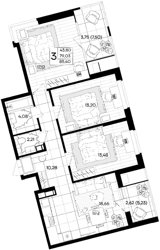 3 | 85.39 / 43.80 м² | от 9 222 120 руб. (108 000 руб./м²) | Планировка |