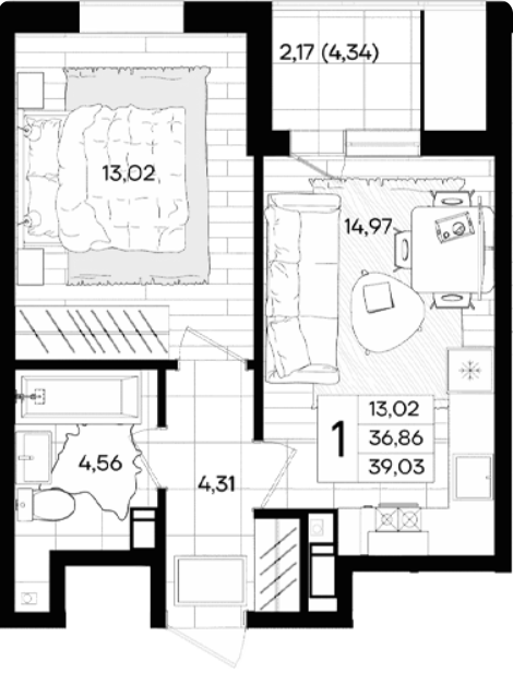 1 | 34.28 / 10.83 м² | от 4 730 640 руб. (138 000 руб./м²) | Планировка | |