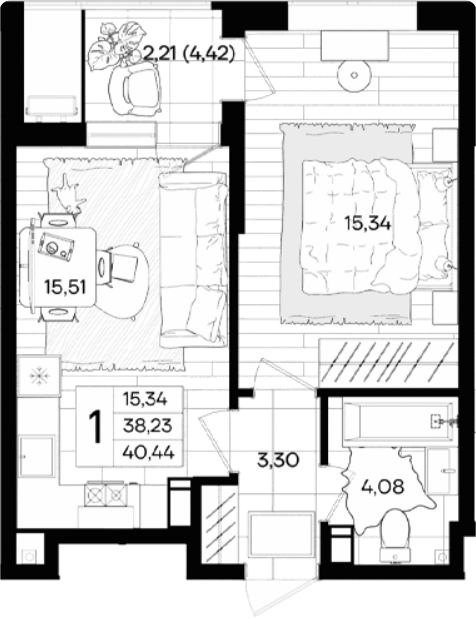 1 | 40.44 / 15.34 м² | от 5 176 320 руб. (128 000 руб./м²) | Планировка | |