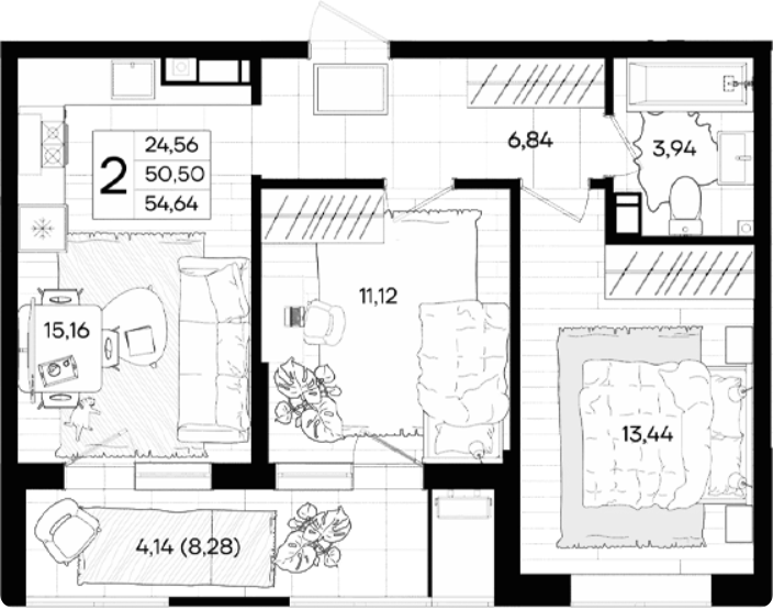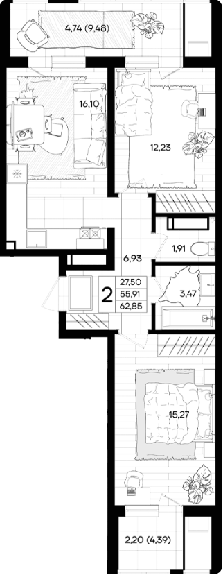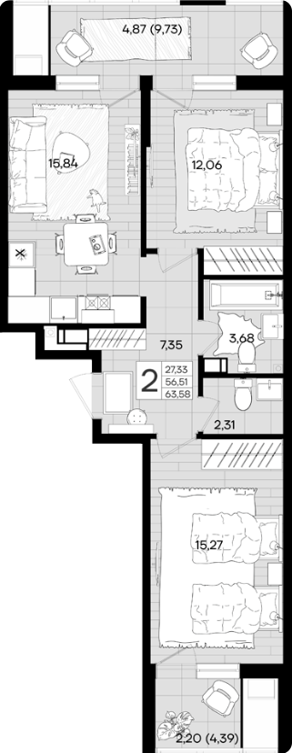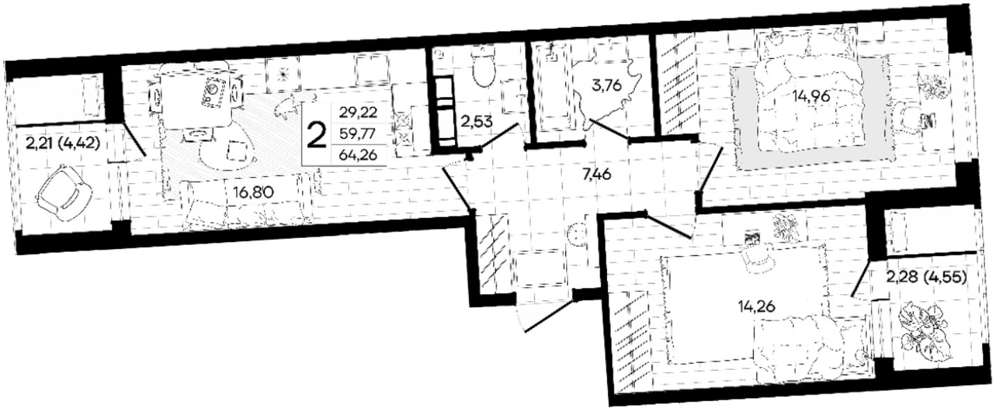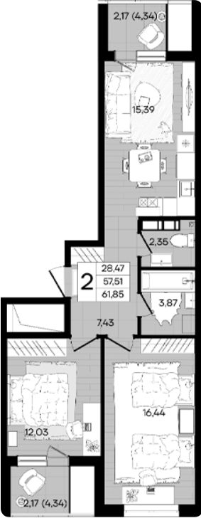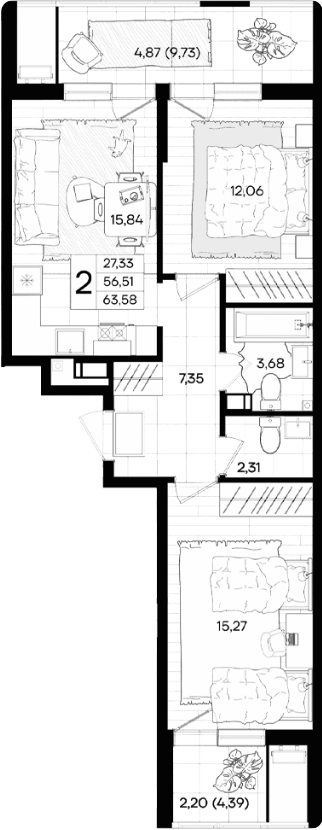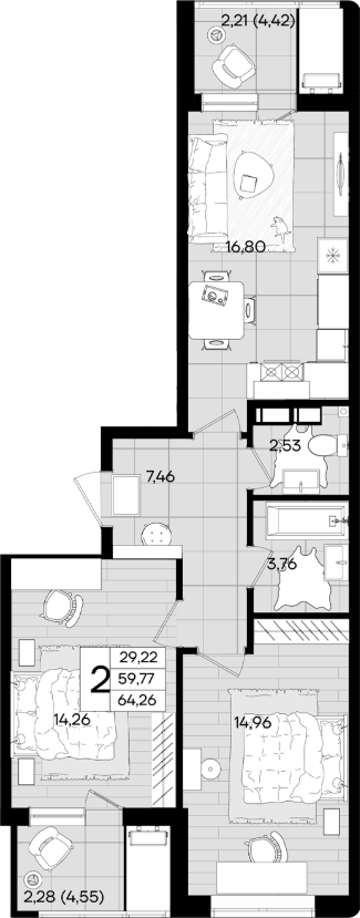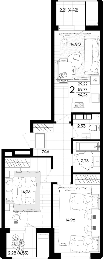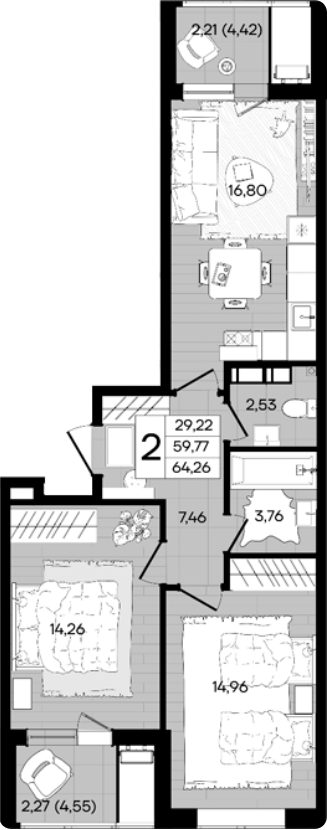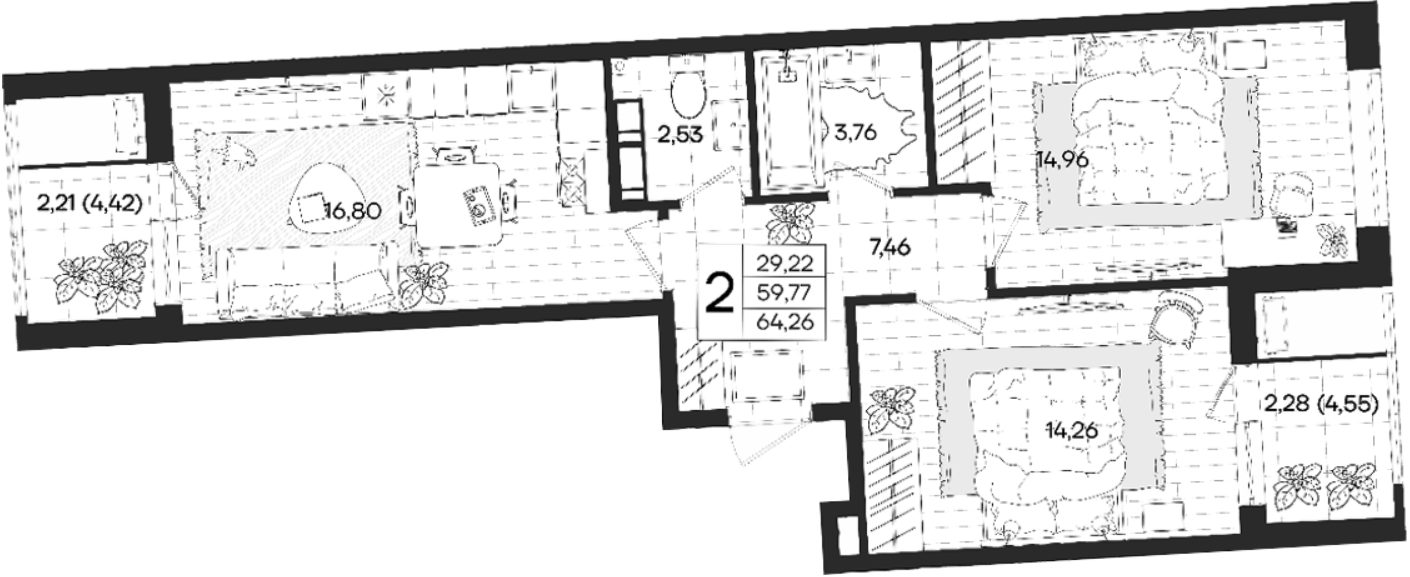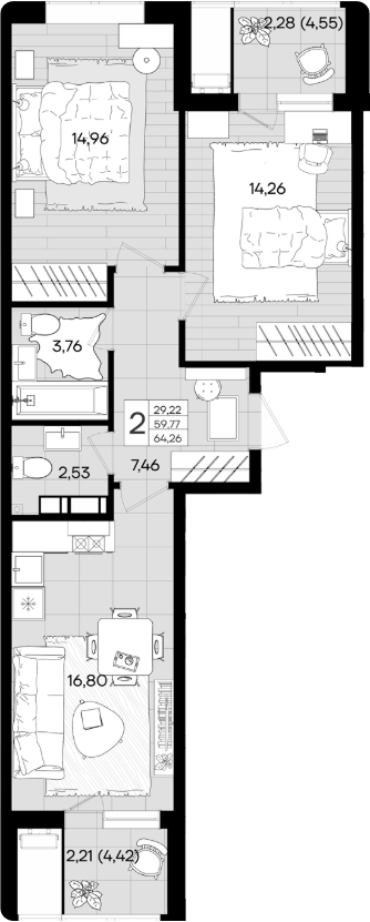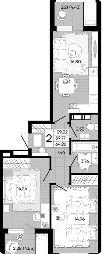 2 | 57.12 / 26.33 м² | от 6 740 160 руб. (118 000 руб./м²) | Планировка |