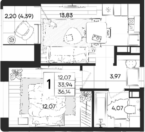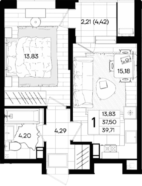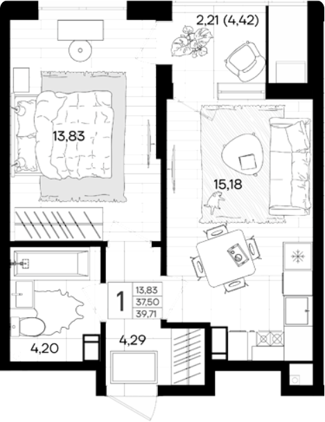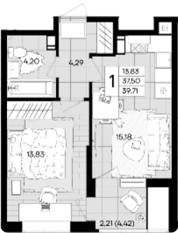 1 | 39.71 / 13.83 м² | от 5 479 980 руб. (138 000 руб./м²) | Планировка | |