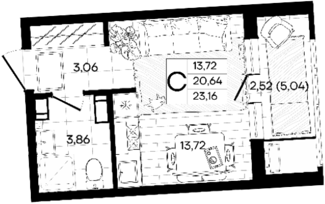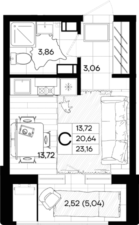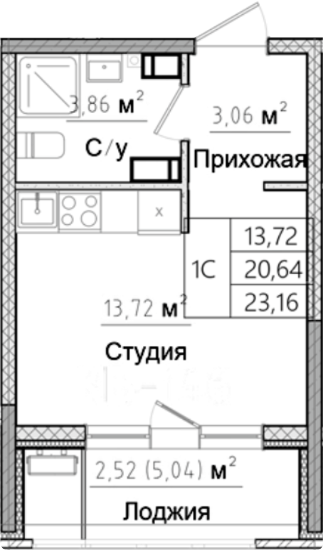 студия | 23.16 / 13.72 м² | от 3 589 800 руб. (155 000 руб./м²) | Планировка | |