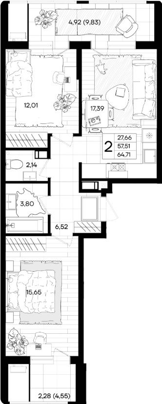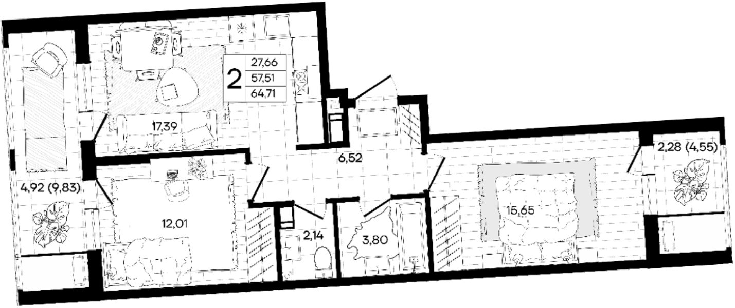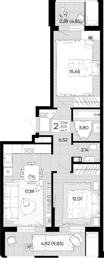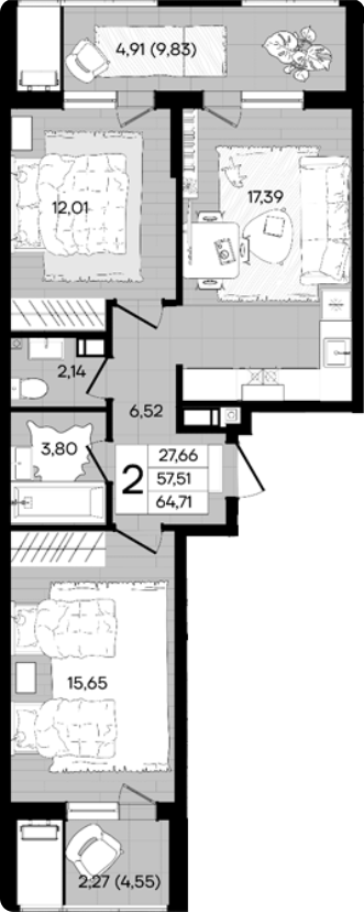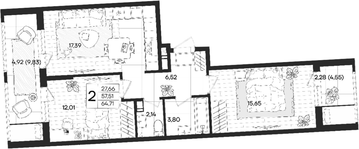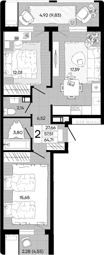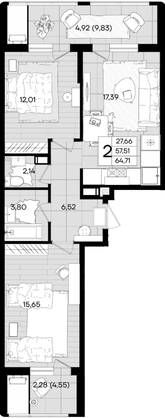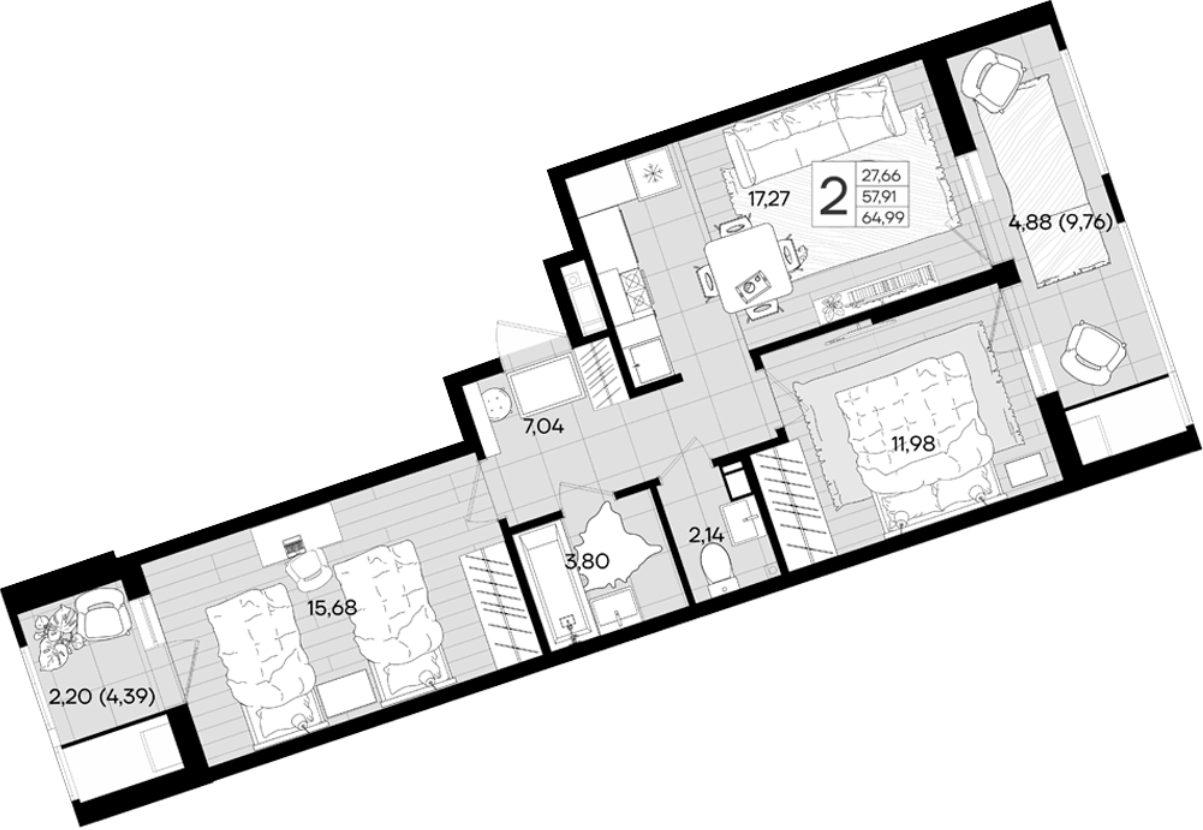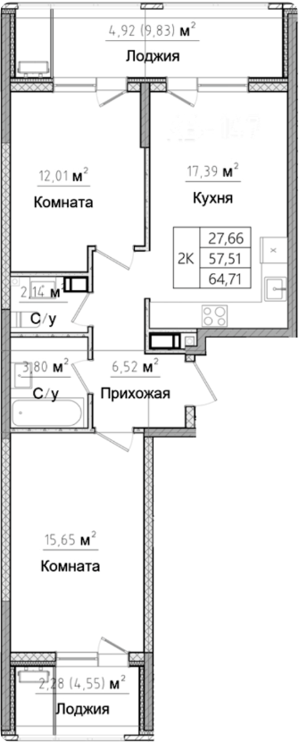 2 | 64.71 / 27.66 м² | от 6 988 680 руб. (108 000 руб./м²) | Планировка |
