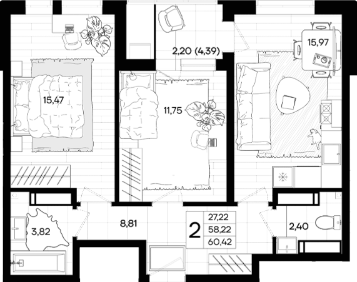 2 | 60.42 / 27.22 м² | от 6 525 360 руб. (108 000 руб./м²) | Планировка | |