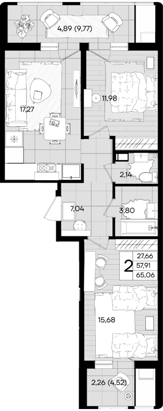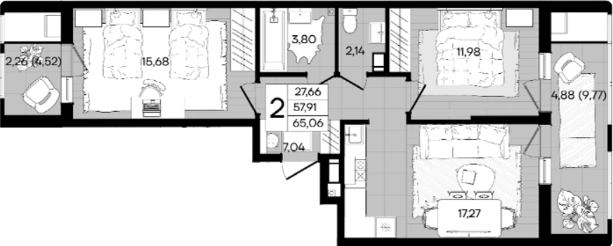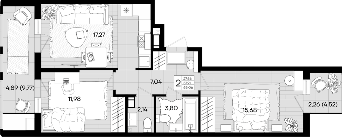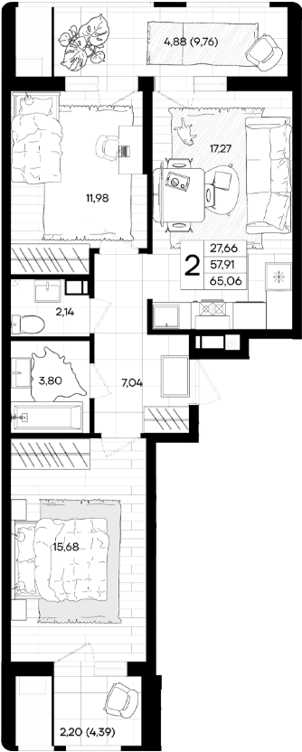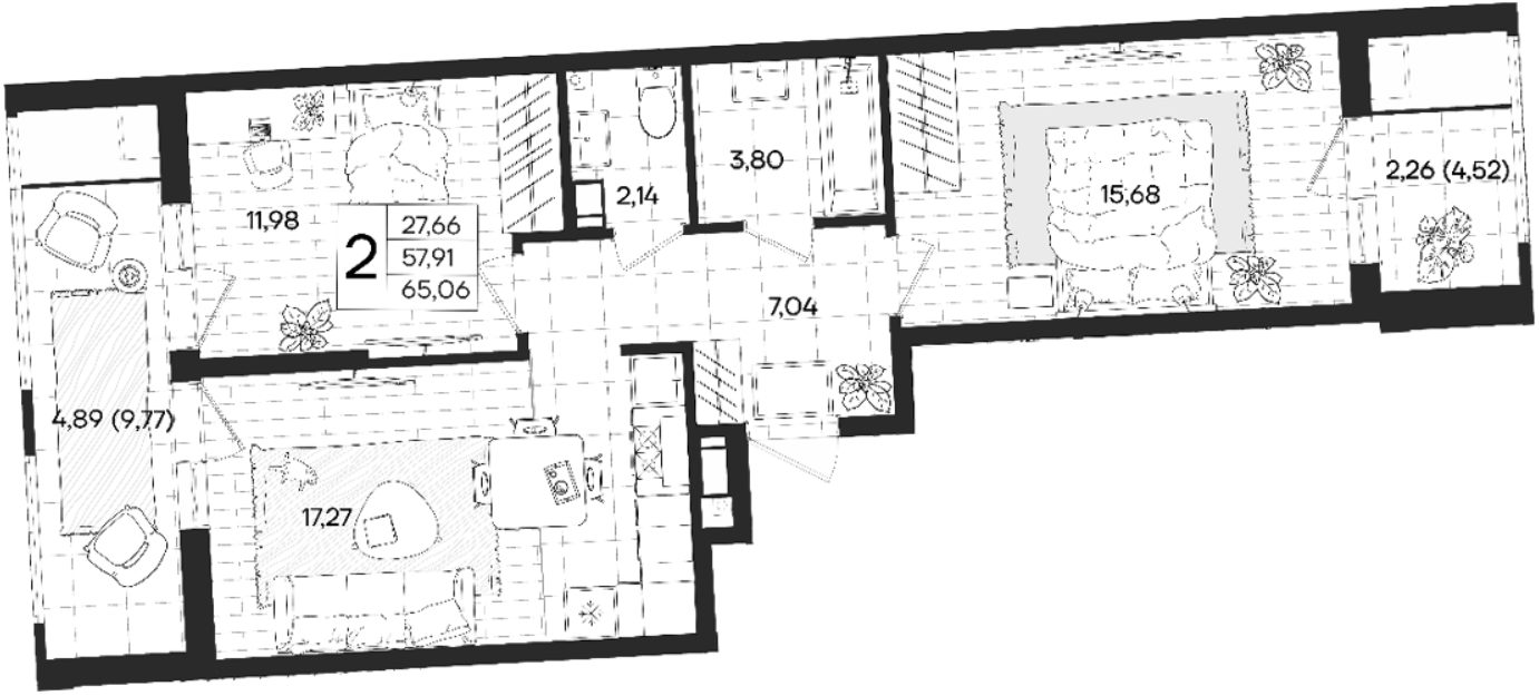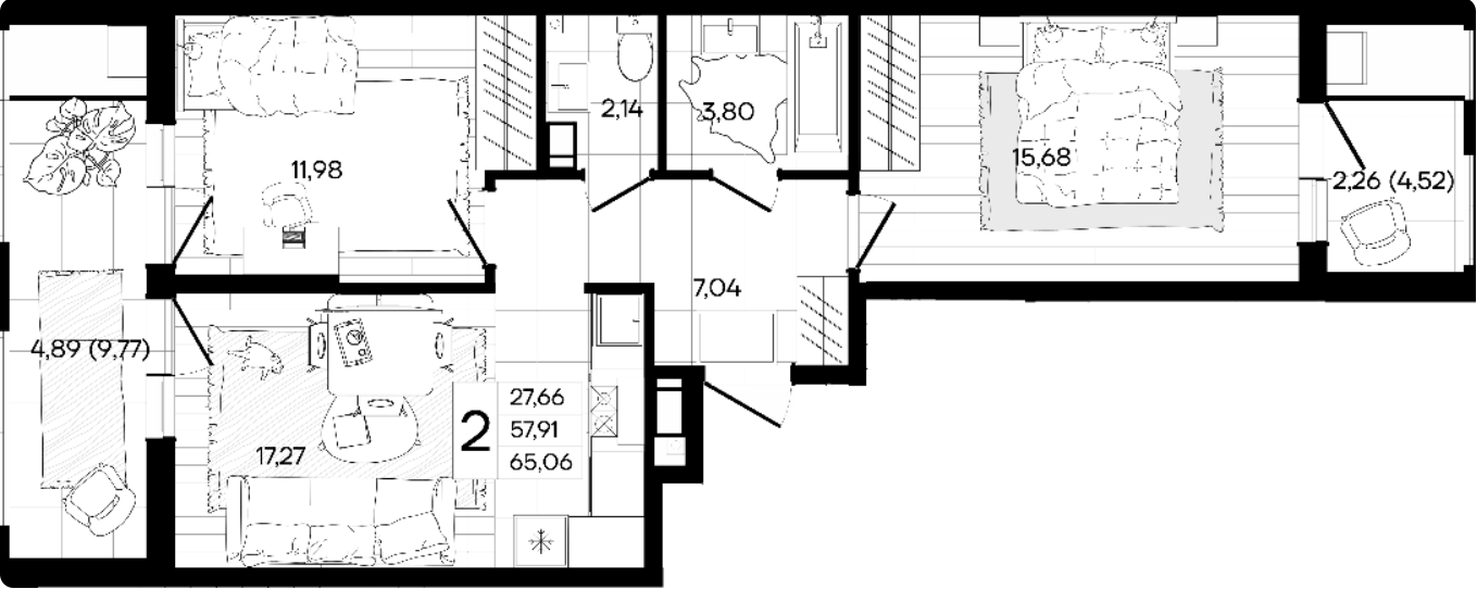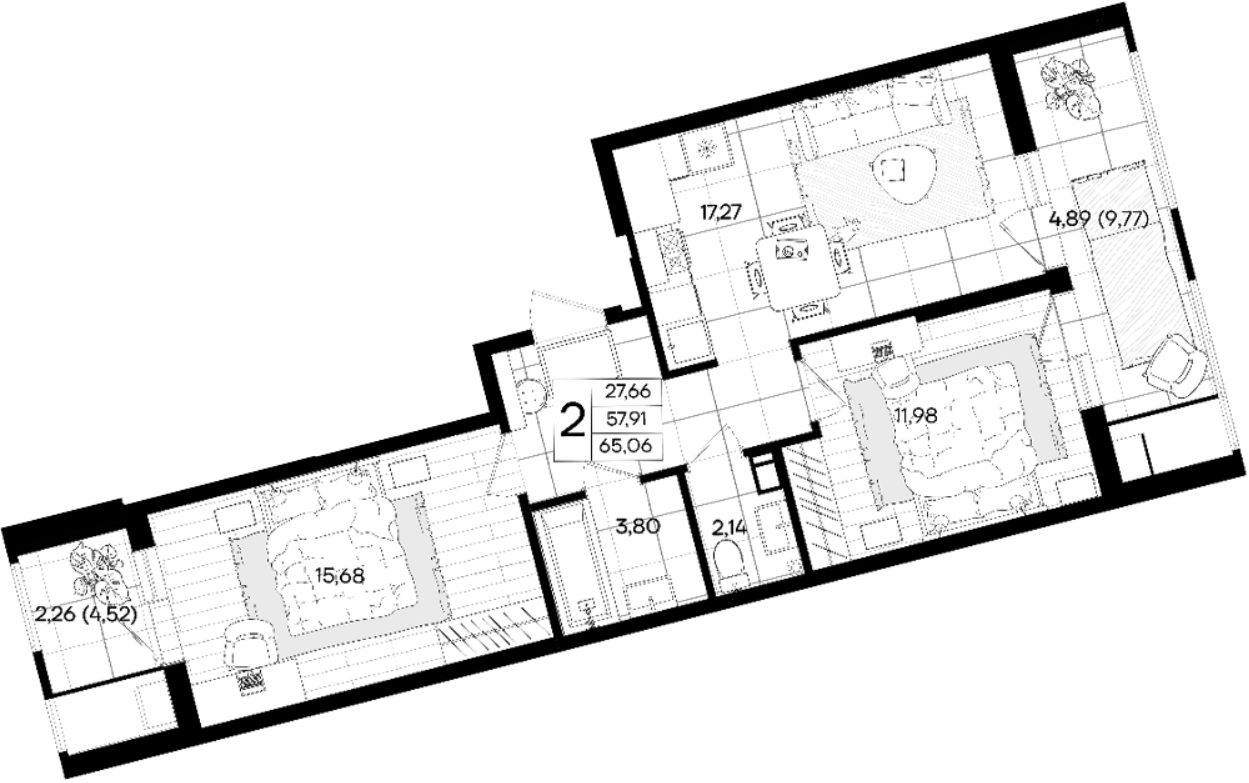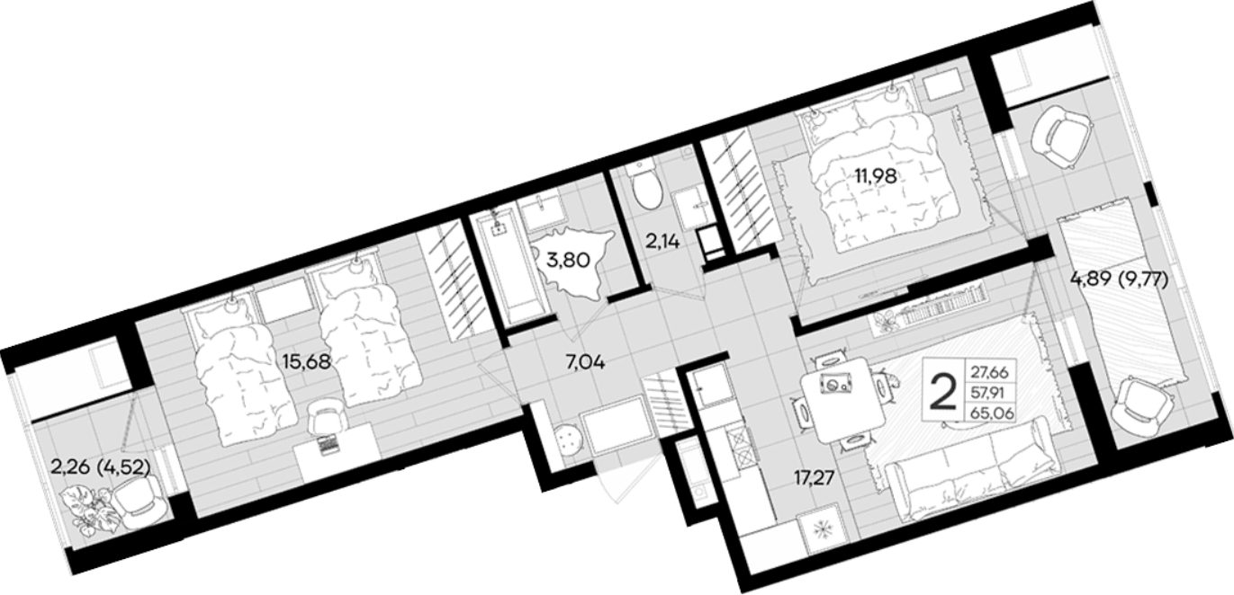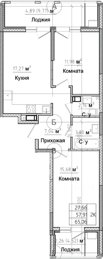 2 | 65.06 / 27.66 м² | от 7 026 480 руб. (108 000 руб./м²) | Планировка | |