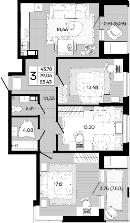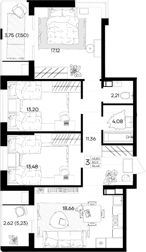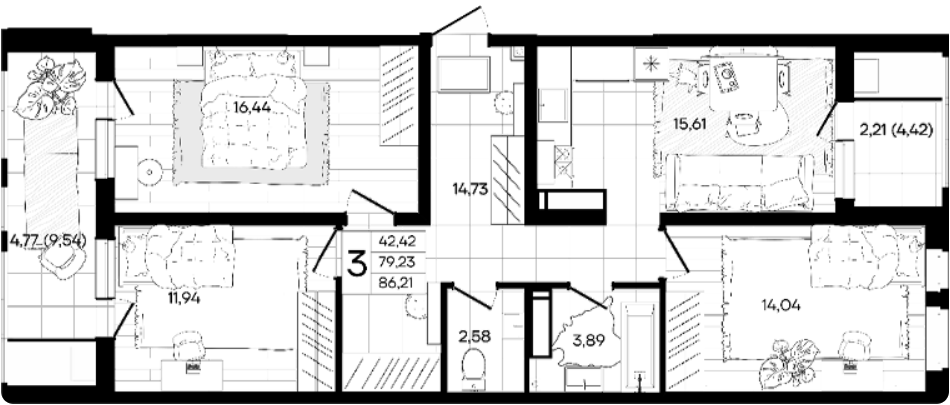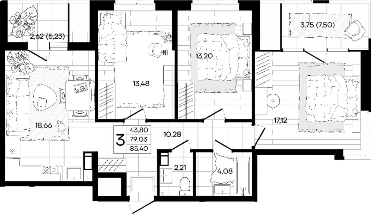 - Трехкомнатные апартаменты, около 80 кв. метров.