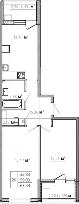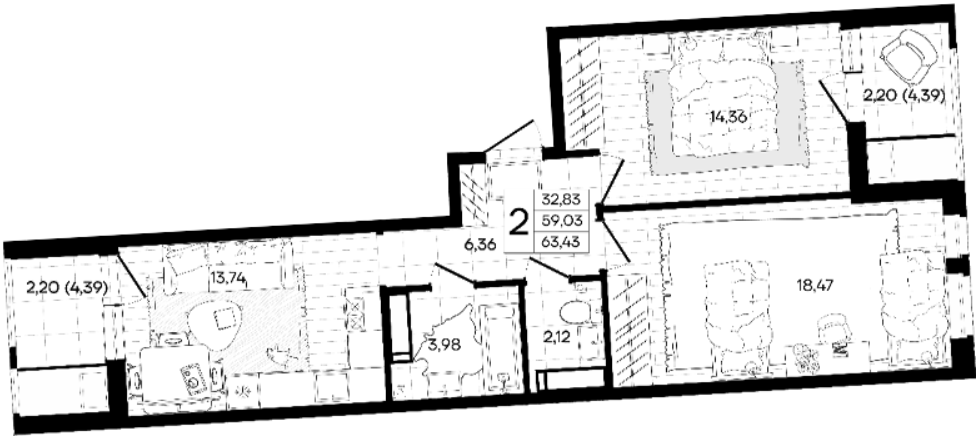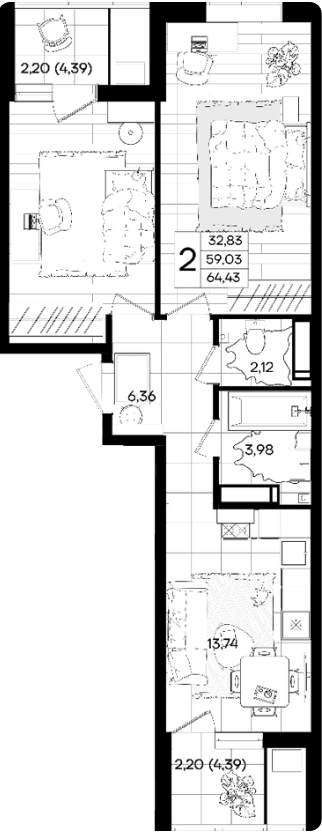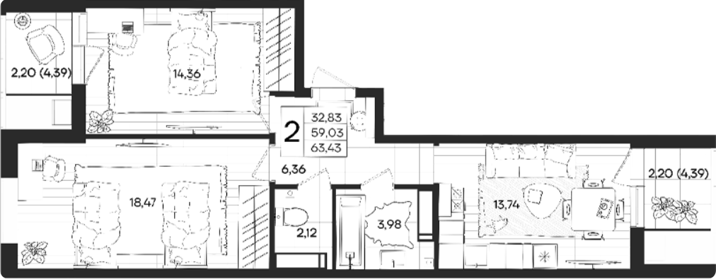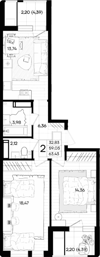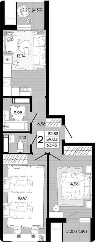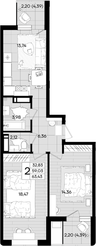 2 | 63.43 / 32.83 м² | от 6 850 440 руб. (108 000 руб./м²) | Планировка | |