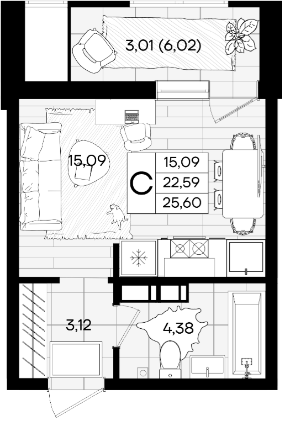 студия | 25.60 / 15.09 м² | от 3 968 000 руб. (155 000 руб./м²) | Планировка | |