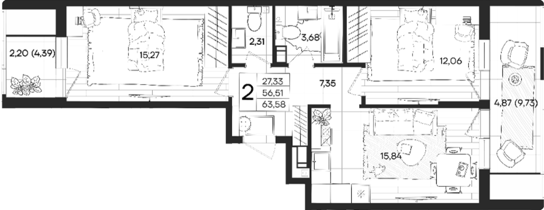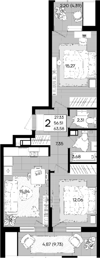 2 | 63.58 / 27.33 м² | от 6 866 640 руб. (108 000 руб./м²) | Планировка | |