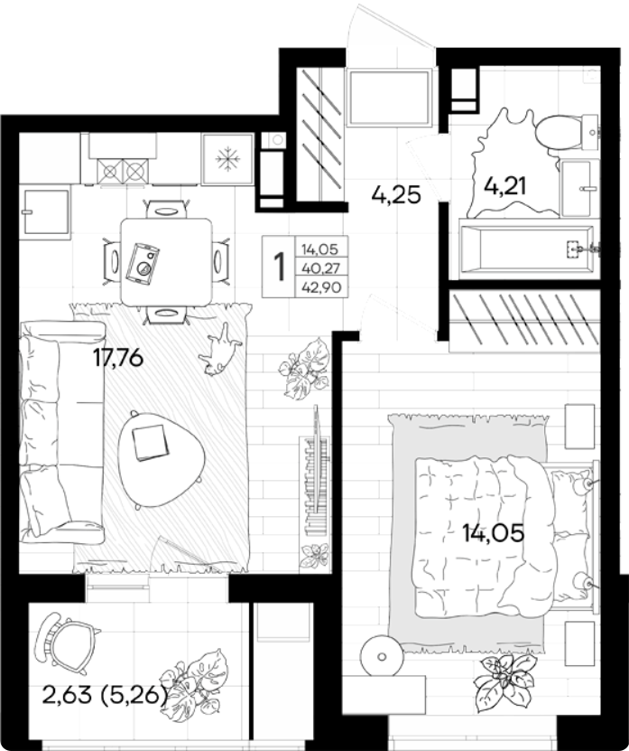 1 | 45.26 / 14.41 м² | от 5 793 280 руб. (128 000 руб./м²) | Планировка | |