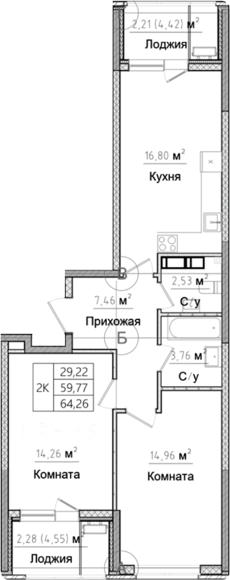 2 | 64.26 / 29.22 м² | от 6 940 080 руб. (108 000 руб./м²) | Планировка | |