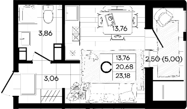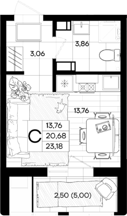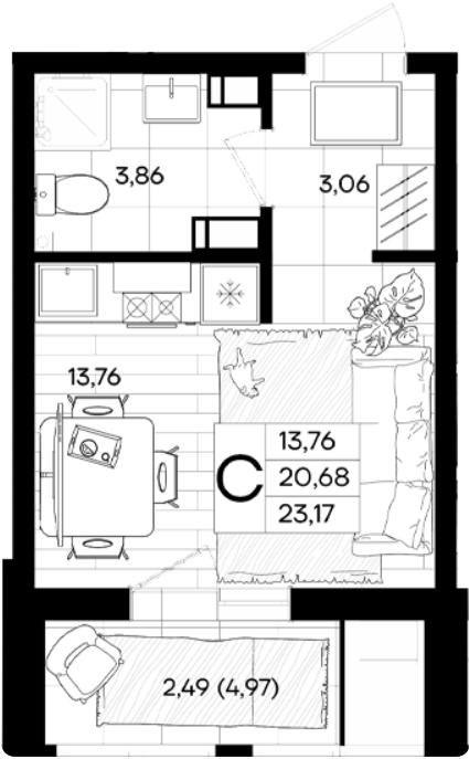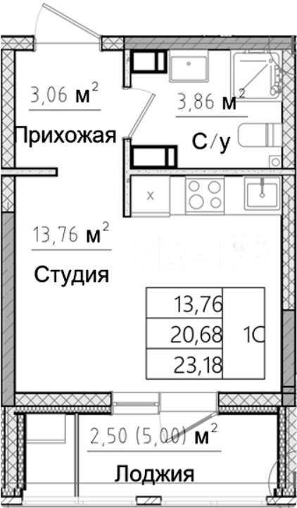 студия | 23.46 / 13.76 м² | от 3 636 300 руб. (155 000 руб./м²) | Планировка | |