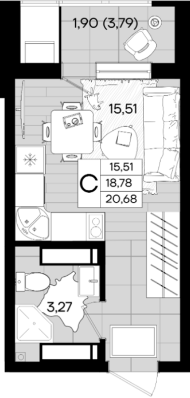 студия | 20.68 / 15.51 м² | от 3 205 400 руб. (155 000 руб./м²) | Планировка | |