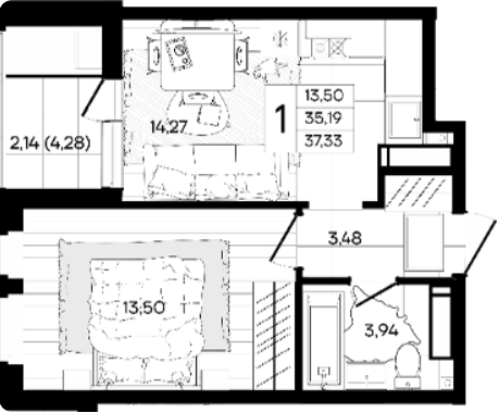 1 | 37.33 / 13.50 м² | от 5 151 540 руб. (138 000 руб./м²) | Планировка | |