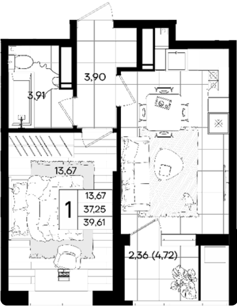 1 | 39.61 / 13.67 м² | от 5 466 180 руб. (138 000 руб./м²) | Планировка |