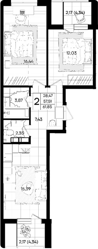 2 | 57.12 / 26.33 м² | от 6 168 960 руб. (108 000 руб./м²) | Планировка | |