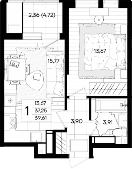 1 | 39.61 / 13.67 м² | от 5 052 176 руб. (127 548 руб./м²) | Планировка | |