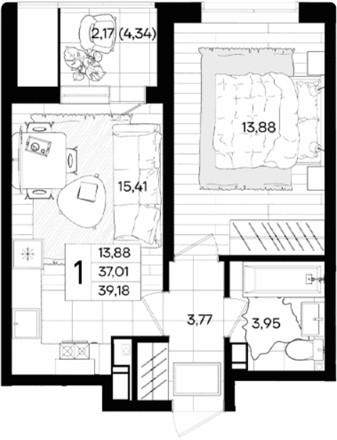 1 | 39.18 / 13.88 м² | от 5 406 840 руб. (138 000 руб./м²) | Планировка | |
