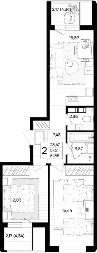 2 | 61.85 / 28.47 м² | от 6 679 800 руб. (108 000 руб./м²) | Планировка | |