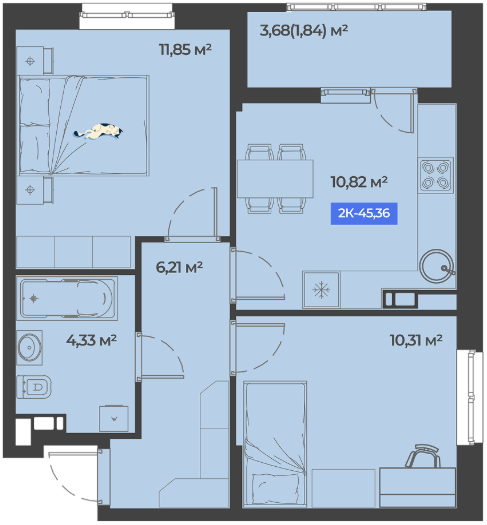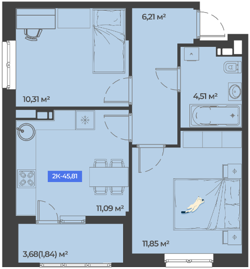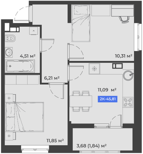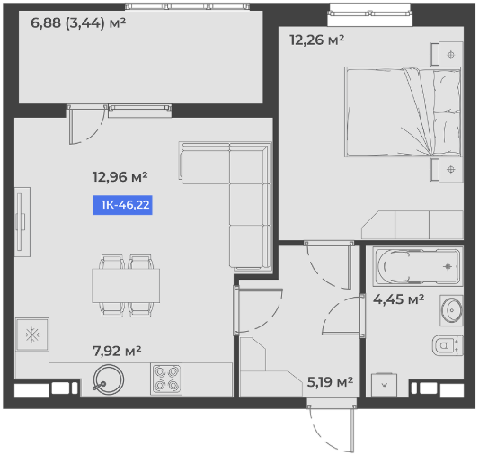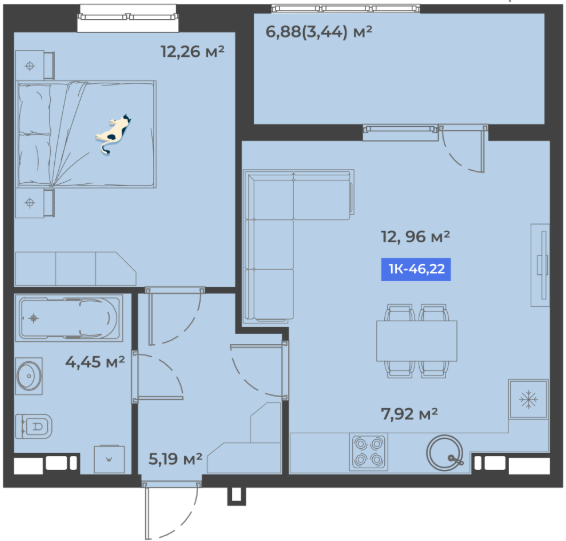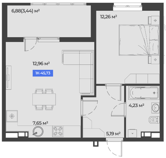 | 1 | 45.73 / 12.26 м² | от 6 402 000 руб. (139 996 руб./м²) | Планировка | |