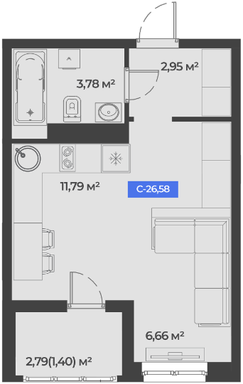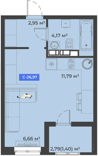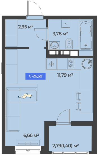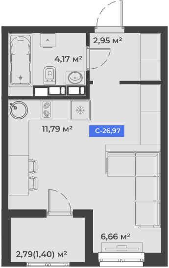 | студия | 26.58 / 11.79 м² | от 4 253 000 руб. (160 008 руб./м²) | Планировка | |