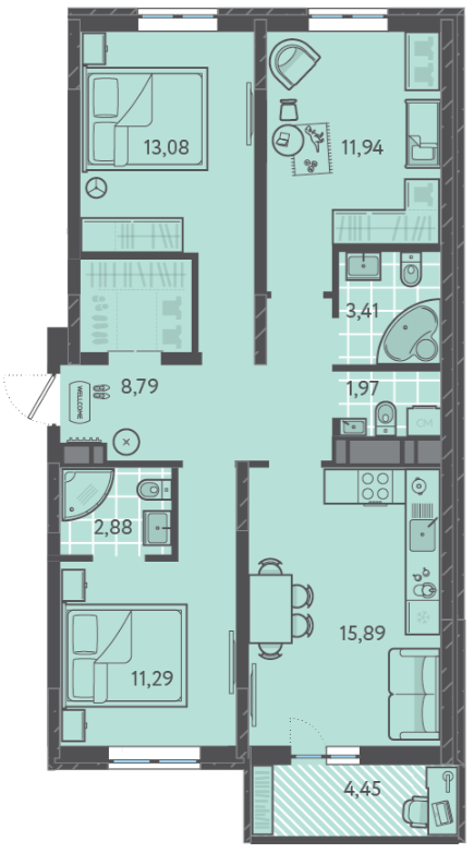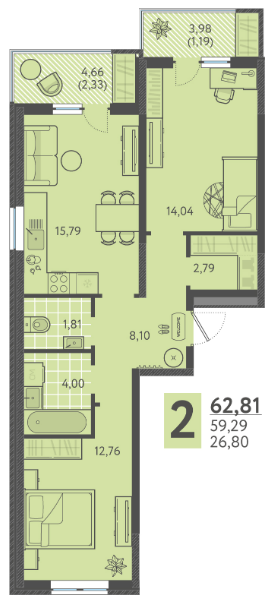 | 2 | 62.81 / 26.80 м² | от 7 588 400 руб. (120 815 руб./м²) | Планировка | |