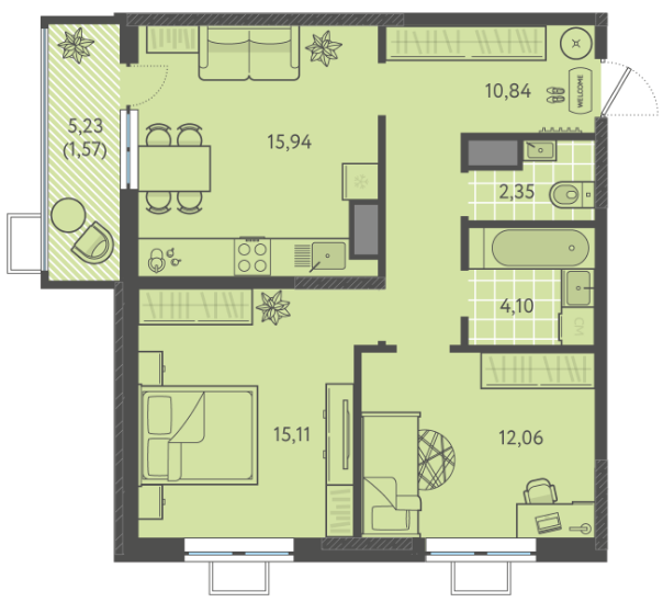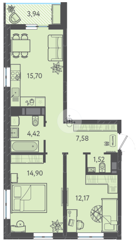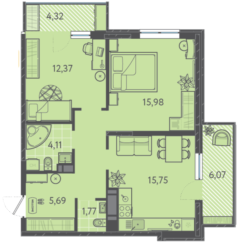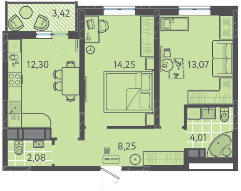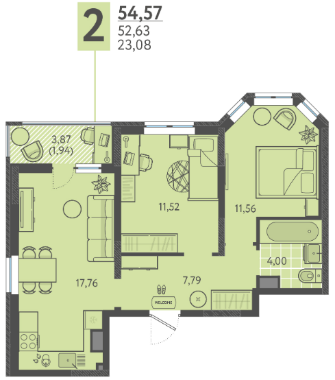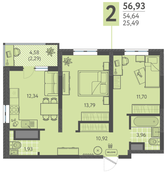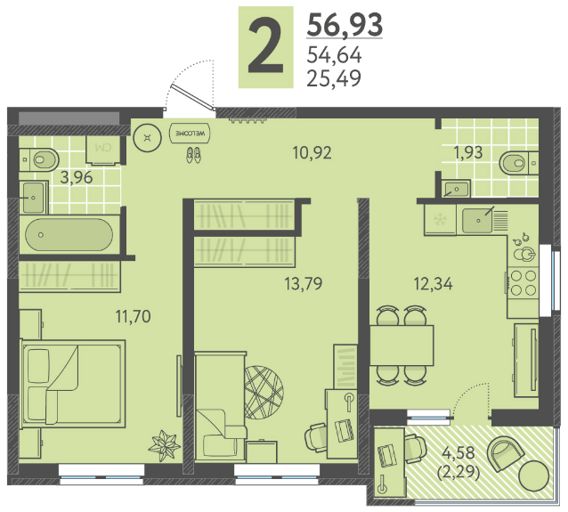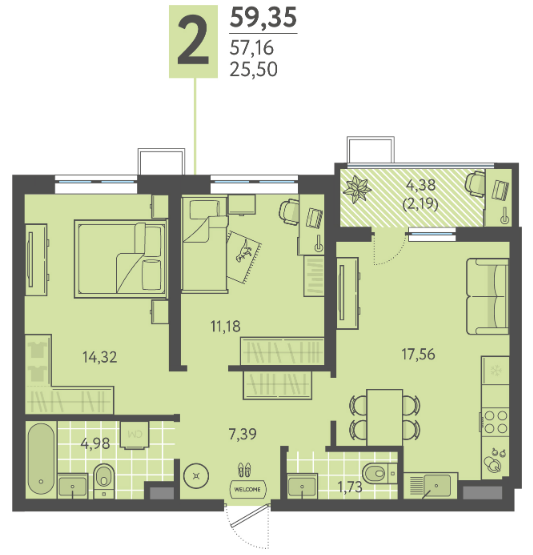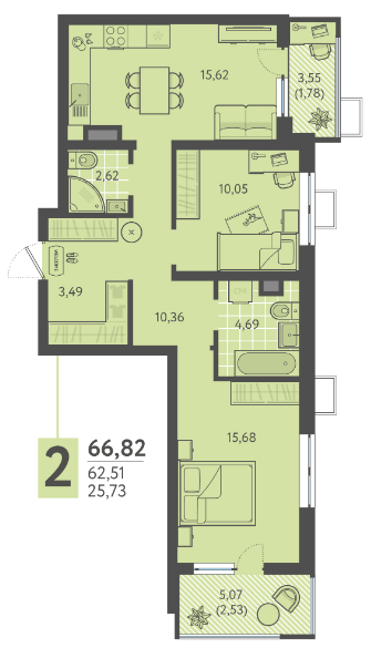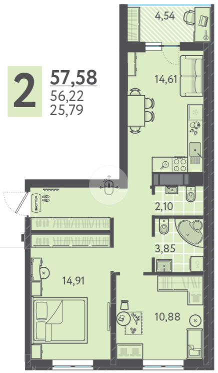 | 2 | 57.18 / 25.79 м² | от 6 175 440 руб. (108 000 руб./м²) | Планировка |
