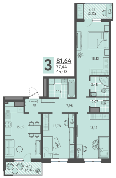 | 3 | 81.64 / 44.03 м² | от 8 812 800 руб. (107 947 руб./м²) | Планировка |
