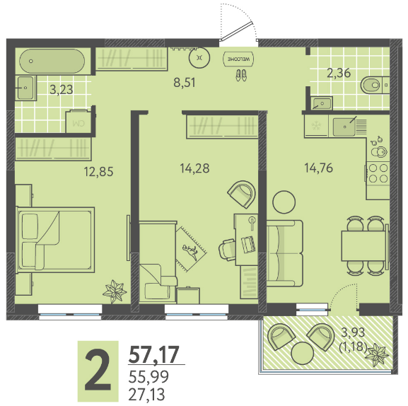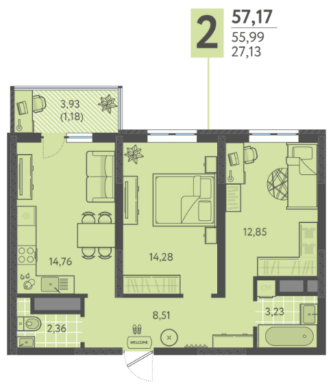 | 2 | 57.17 / 27.13 м² | от 6 164 640 руб. (107 830 руб./м²) | Планировка | |